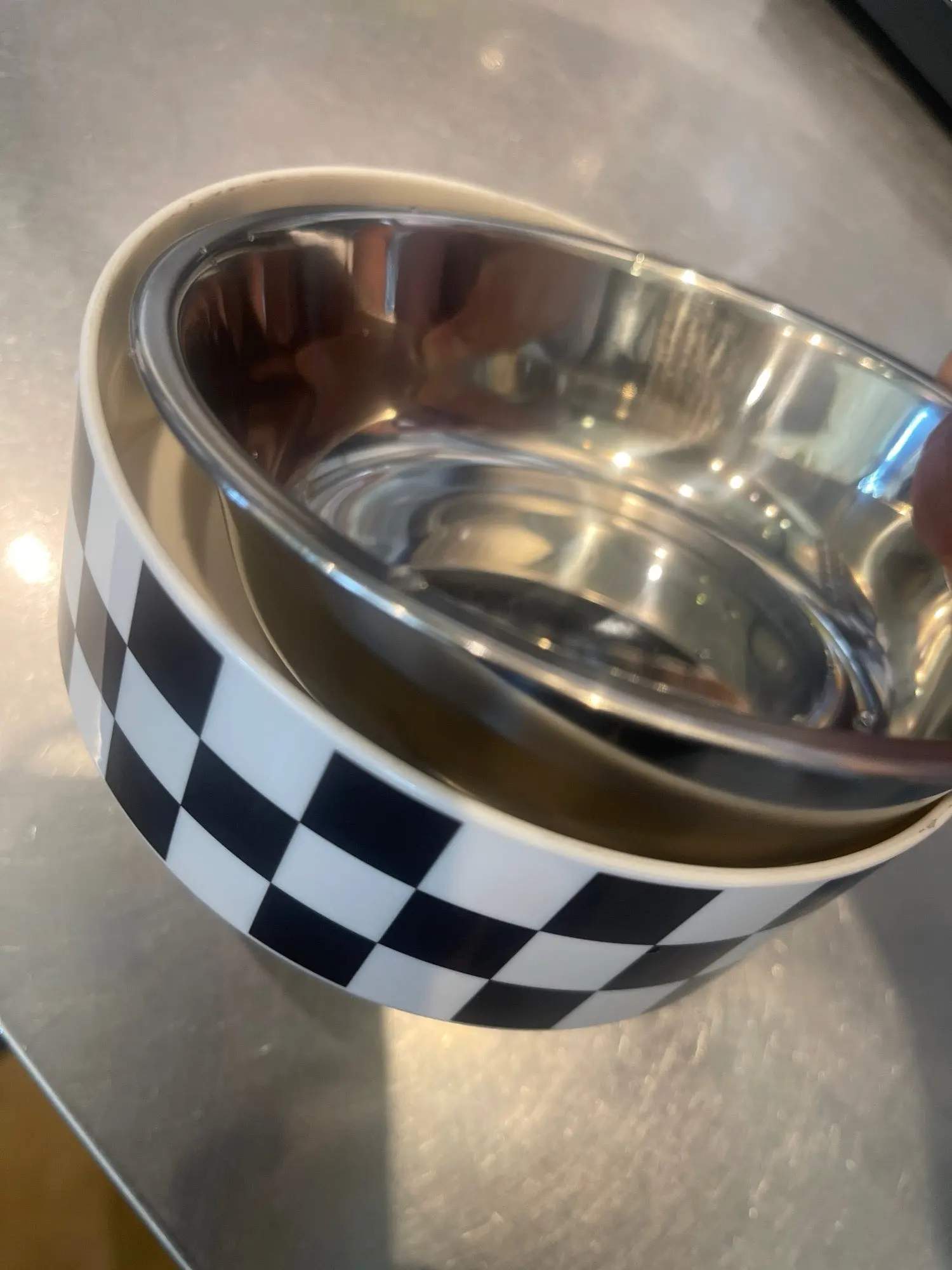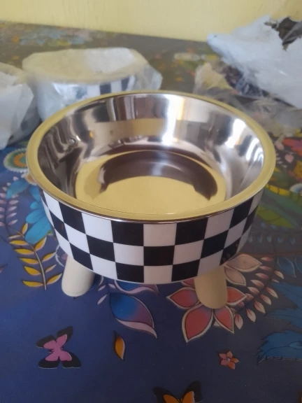 Plato elevado para mascotas con diseño a cuadros en blanco y negro y patas de madera – Petify and Co